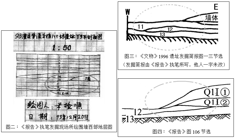 值得注意的是,从已出版的《报告》中,人们还很难直接发现执笔人为何要完全推翻原始 资料重新勾画地层与遗迹的理由和想法,估计可能与“Q2两期墙体的修筑情况大致与Q1 Ⅰ期墙体的上、下层相若”(《报告》P227)的意识有关。